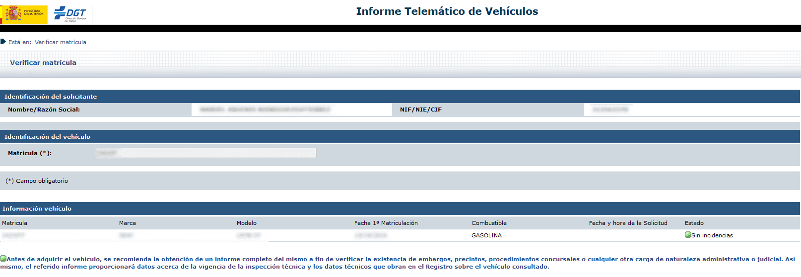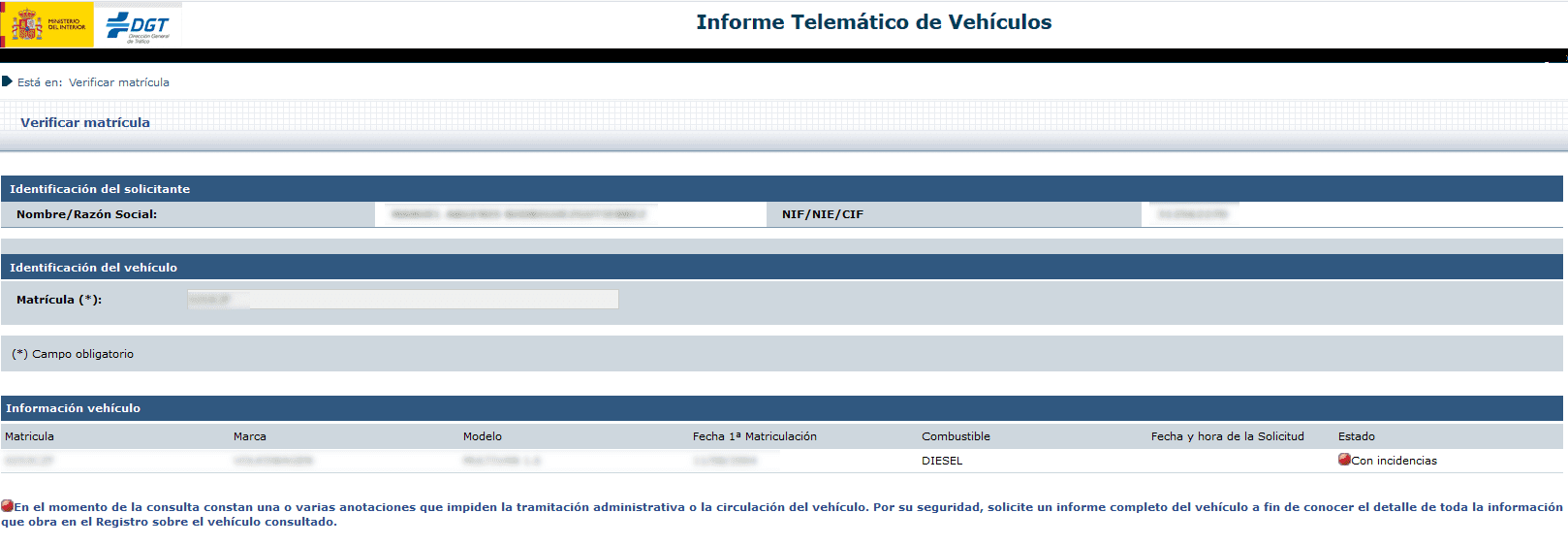 Si el informe muestra que constan incidencias, puedes solicitar un informe completo del vehículo para conocer el detalle de la información sobre el vehículo consultado.
